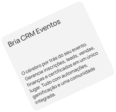 Com o Bria CRM Eventos, você conecta ponta a ponta: captaçã o de leads, vendas, gestão da equipe, comunidade, certificados e relatórios.